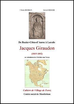 Parmi ces derniers, figurait un certain « Jacques Giraudon », dont Claude Latta révélait, en deux à trois lignes, qu’il était né à « Rozier-Côtes-d’Aurec » en « 1815 », qu’il était décédé en « 1892 », qu’il avait été « prêtre au Texas », qu’il était « rentré en France en 1864 » et qu’il avait été « aumônier de la Sainte-Famille à Beaujeu » : de quoi attirer l’attention et piquer la curiosité de deux « Roziérois » que l’œuvre missionnaire en Inde de leur « compatriote » Mère Edwige avait déjà réunis dans une même recherche historique ! Mais, bien que, après Claude Latta, d’autres chercheurs – tels que François Lagarde, au niveau national , Yannick Essertel, au niveau régional , ou Daniel Allezina, au niveau local – se soient penchés sur les missions en Amérique, l’aventure n’a pas été aisée : outre que Jacques Giraudon semble avoir été un humble missionnaire qui n’a guère laissé de traces – il n’en a laissé aucune à Rozier même, en tous cas –, le fait que la plupart des archives et l’essentiel de la bibliographie se trouvent aux Etats-Unis ne facilite pas le travail de recherche.
